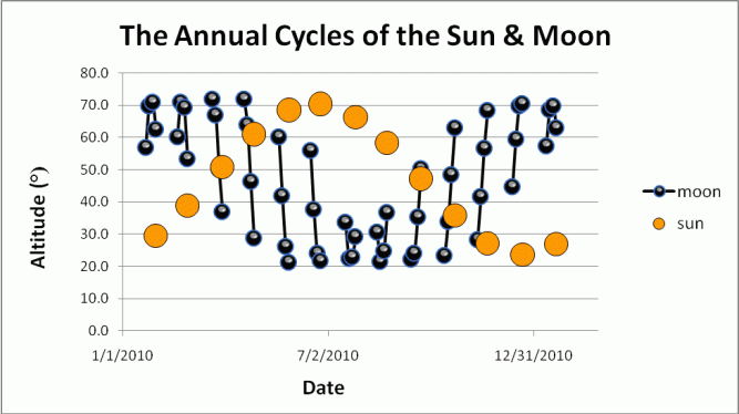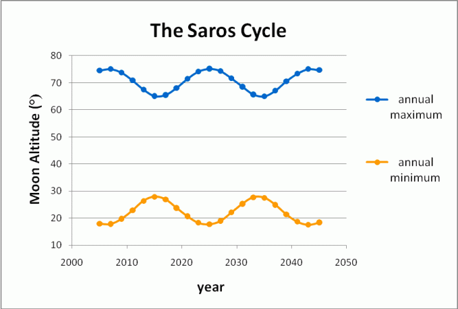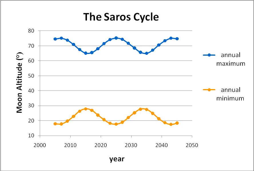 On top of the moon’s complex monthly movements, the 18-year Saros cycle also affects its position. In the most extreme years of this cycle, the moon’s altitude can swing a full 20° more from high to low than it does during its sedate years.