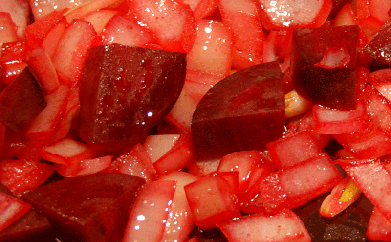 I don’t peel my beets. If they look a little grungy, I just scrub them with a nylon-net-covered sponge and exfoliate the outer layer then slice. When I tossed them into the pan, their brilliant red bonded with the cut edges of the onions so vividly that I had to run for my camera.