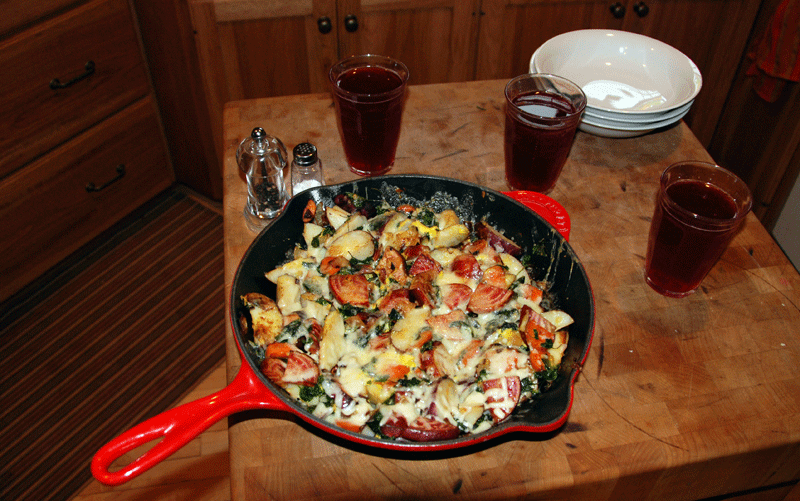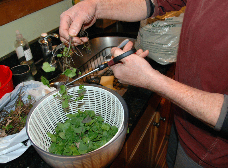 The third meal was roasted veggies drowned in yeasty gravy, substituting garlic mustard for the parsley in the recipe. This is fabulous gravy, and the garlic mustard worked very well. Roast or micro wave your favorite root vegetables, then top with gravy.