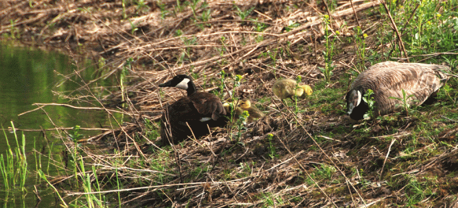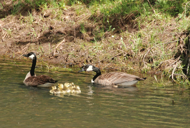 As we approached, the adults slipped into the water closely followed by a ball of yellow fluff. The five goslings paddled after their parents, pressed together like an inner tube raft. Geese usually hatch a clutch of three to eight eggs, so five should make a very manageable family.