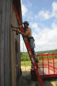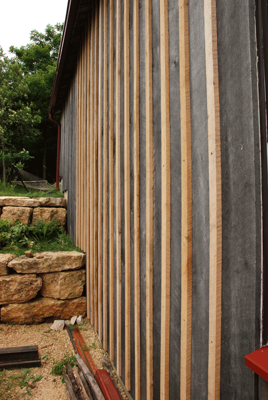 If you want to learn more about board at batten, here are a couple of how-to sites, Board and Batten and How to Make Board and Batten — although I will note that we have not followed their advice. Our barn is not insulated, which makes a much simpler plan possible. Nail the boards to the horizontal girts and screw the battens to the girts through the gaps between them.