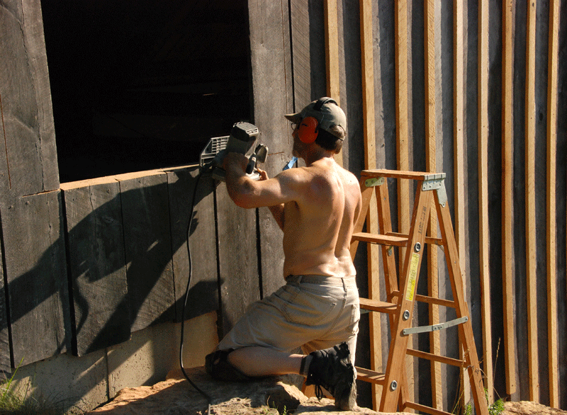 We’d done a lot of prep work, placing a new girt and cutting out the old. Getting the 4×4 framing complete. We did not want to start cutting out the barn boards till we knew we could finish the job that same day.