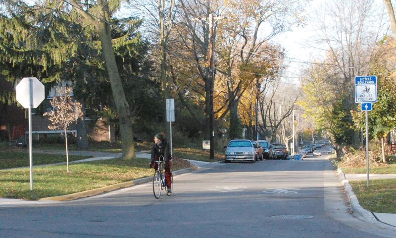“It’s an intermediate step between busy streets and a bike trail,” according to Robbie Webber, who supported biking when she was Fifth District Alderperson in Madison.  “Trails don’t go everywhere,” said Webber in a recent telephone interview.  “If you want a place where bikers feel comfortable, you need to move to another level of bicycle facility, but you don’t have establish a whole separate system.  If more and more people see their neighbors and friends and family commuting by bike — they are more likely to try it.  When you make it easier for people to bike, all the pieces come together.”