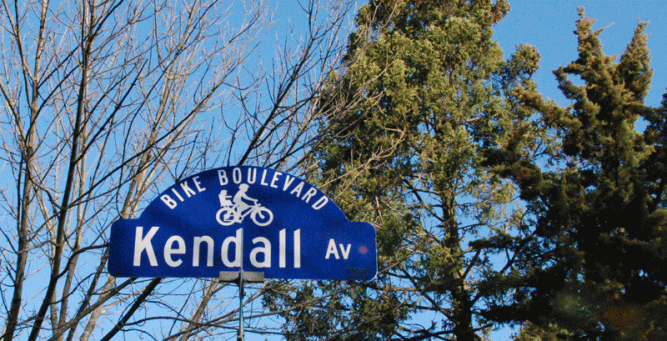 And now –Just 2 blocks from my house in the other direction– Kendall Avenue has been transformed from a narrow and problematic driving street into a bicycle boulevard.  Cars can still move along it, but their way has been complicated with traffic-calming devices like bumps and cute little round-abouts and signs and big symbols painted on the pavement that make it clear bikes have the right of way here.