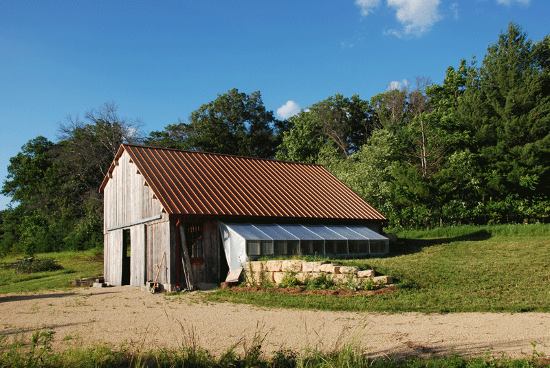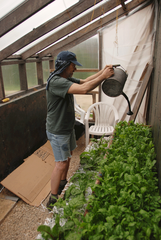 • Yes, a greenhouse has been a great boon. It will be so much more useful when we are living next door, but it works out pretty well now. We have been teaching at the state university in Platteville, and our land is just a mile off the path between our house in Madison and the campus in Platteville. So we have been able to stop and water en route. Summer break starts next week, and that means we will be able to camp out there for days!