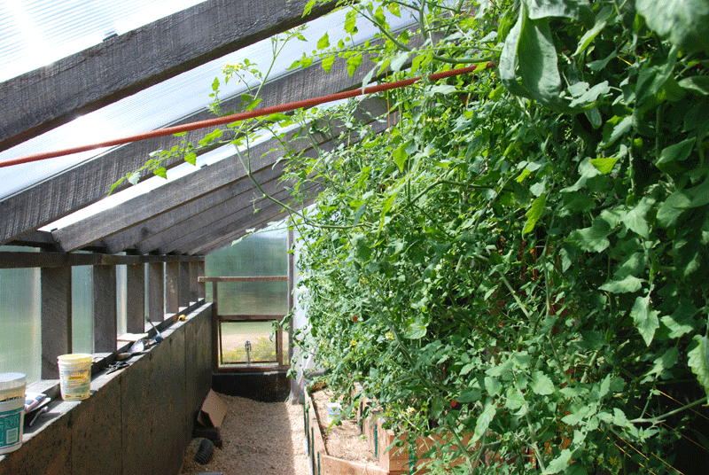 Last year, our maiden voyage into greenhouse gardening, was a mixed success.  We had a good crop of chard and kale and a few carrots and a very few beets, as well as a small patch of spinach.  Then we planted tomatoes for a second crop, and the vines were frighteningly vigorous, but produced almost no fruit.  (We suspect that not enough polinators got into the greenhouse.)