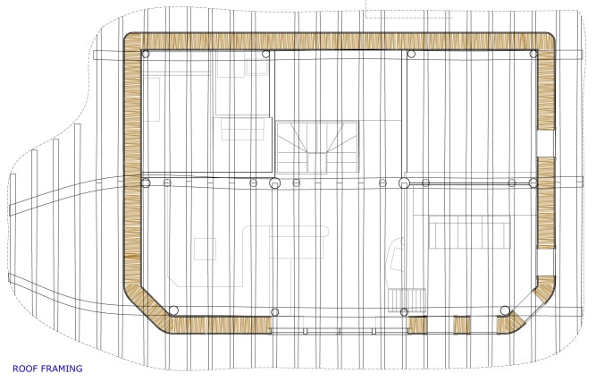 This house design will use 118 individual round wood pieces: branching columns, curving beams and (many, many) relatively straight joists and rafters. The “framing plan” of the roof is shown below, detailing round rafter timbers every 2 feet to support the roof, and resting in turn on a timber frame structure of columns and beams. You can also see my outline for the way the branching columns will be expressed in the house above in the section drawing. Of course, we don’t know exactly how those branches will look until we select the actual trees next week.