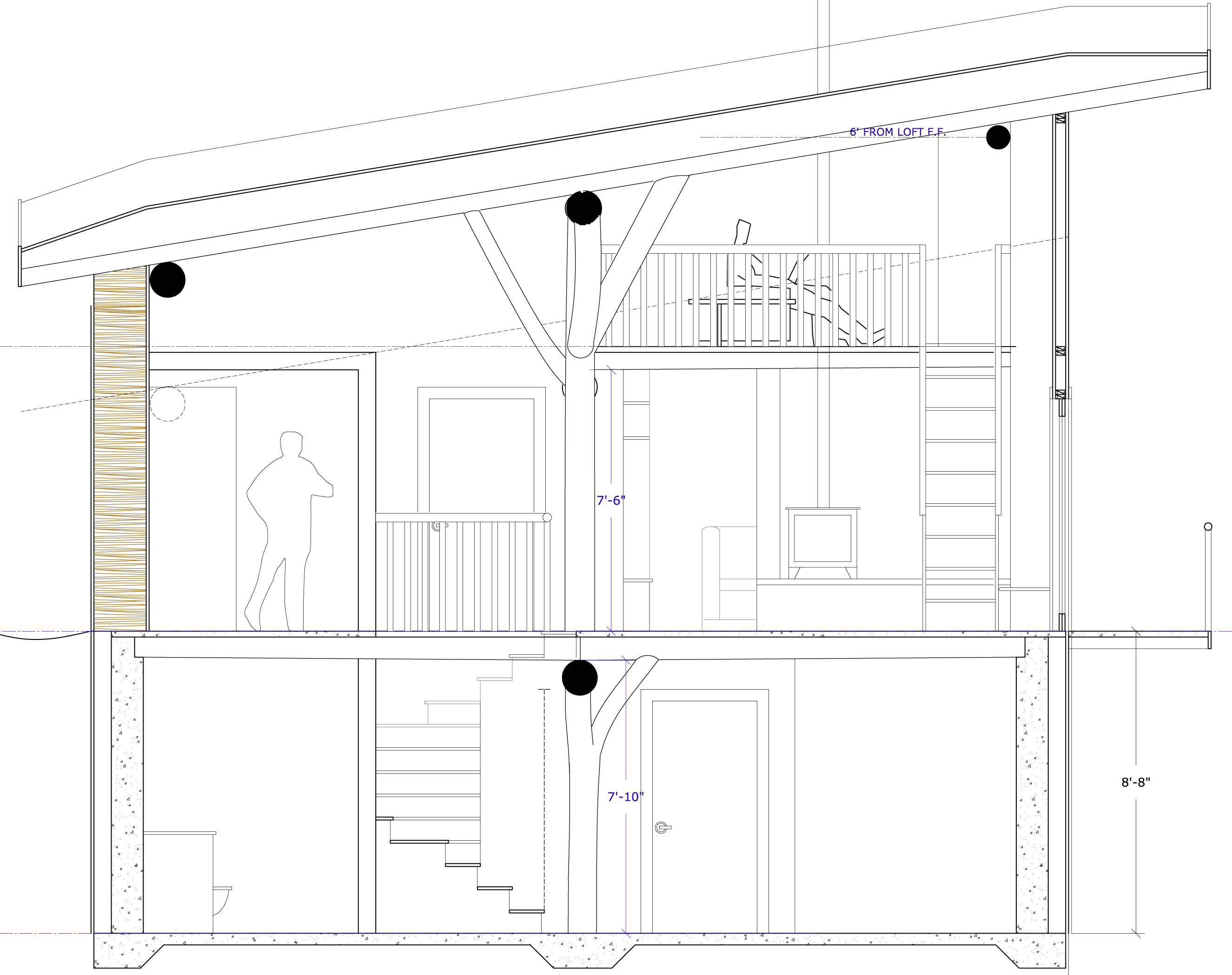 This time has allowed for many iterations and adaptations of the design. Its shrunk significantly from its first version, with three full floors and nearly 2000 square feet (still less than the average new home today) to a compact main 900 sf main floor with a partial basement holding an earth sheltered guest room, office and mechanical space and a small loft accessed by ladder over the den. The current design will have a living roof, passive and active solar heating and cooling, straw bale walls and a whole tree structure. It will be quite the natural building sampler when finished!