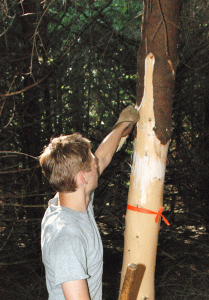 To support a truly green, forest-friendly process, the selected trees are immediately peeled. After its bark is removed, the tree will die and dry to a much lighter weight by the time it is cut sometime this winter. Felling takes place after the ground freezes to cause minimum damage to the forest floor. The lighter timber is easier to handle and requires less power equipment to move around, and that in turn minimizes disruption to the surrounding growing area.