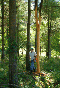 After getting a good start, a sturdy blade at the end of a 5 foot long handle can be used to remove long strips of bark. Eventually, slipping the handle into a 10 foot long electrical conduit can extend a peeler’s reach to 17 feet or so off the ground.