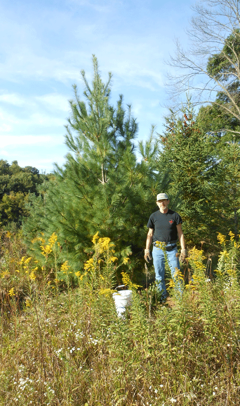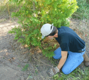 We were no strangers to transplanting trees on our land. During our first few years as we were restoring an area to prairie, we were digging them up with a shovel and moving them by wheelbarrow, and had pretty good success. (see Putting Pines in their Place or tips on Transferring Evergreens