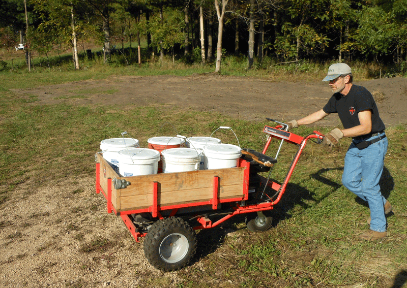 As far as the nifty power wagon — we find it invaluable for many tasks. We chose it because it was the least fuel use for moving a lot of heavy things. Walking behind and guiding it is a very physical job, but doable for an average person.