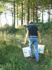 So we were thrilled to preserve the lane trees and fill in a bare spot along the road. Almost all of them survived – thanks to many many gallons of water that we hauled to them with 2 five-gallon plastic buckets and a yoke.