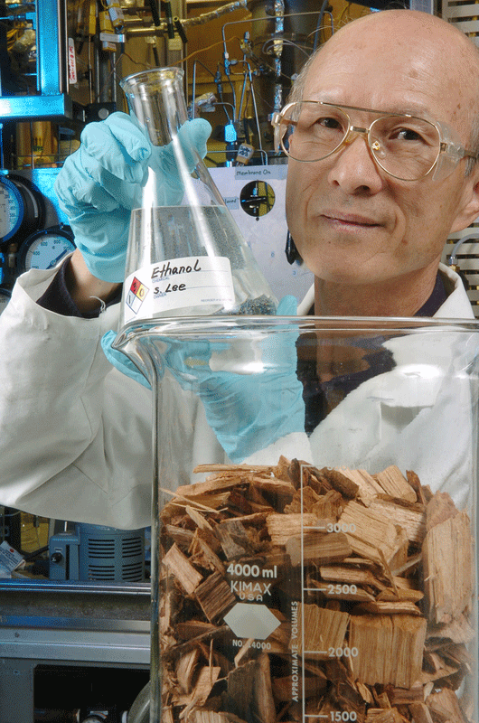 Ethanol can be produced from renewable agricultural products, such as wood chips. Read more: http://www.transportation.anl.gov. (photo credit: Argonne National Laboratory.)