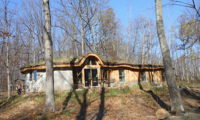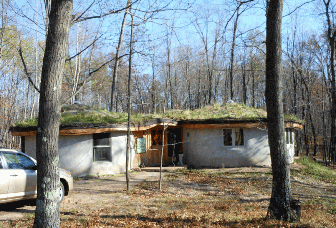 This house is straw bale with a sod roof. and passive solar design. The entrance is between the two round rooms. The room on the left is a studio, and the room on the right is the kitchen/dining/living room.