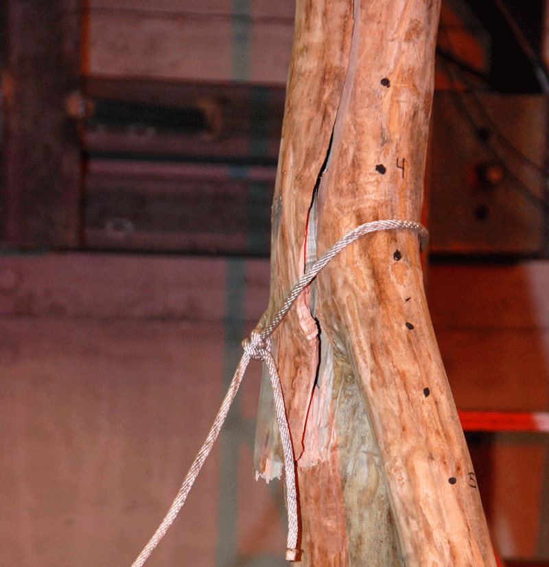 The first tree was placed in what is fundamentally a giant vice and pressure was applied. At 4,500 pounds of pressure, the timber gave a resounding crack and broke. One down – about 90 more to go.
