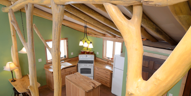 Whole Trees has built with branching tree timbers for years because branching columns reduce the span length needed to hold up the beams, and they provide lateral stability usually created with artificial bracing.