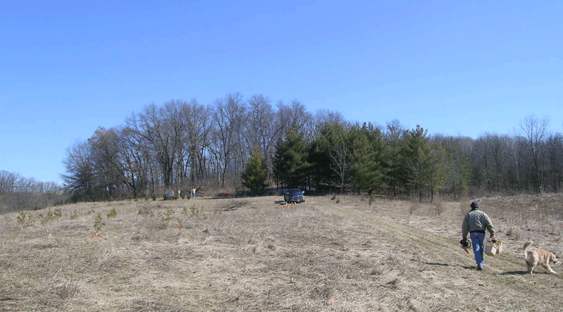 March 2005. Doug is going to join our neighbors cutting out what we hoped would be the end of the oak wilt on our building site. Notice the teensy pines in the left foreground.