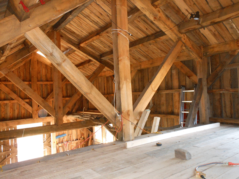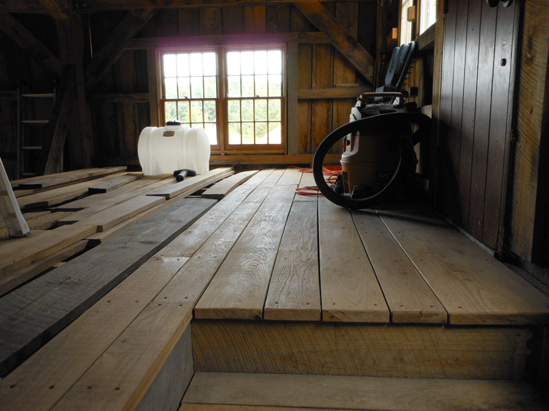 This fall and winter, our major job has been completing the floor in the loft of the barn so that we can move most of the things that have made their home on the barn floor up and out of the way.  The barn floor will become the timber framers’ workshop.  Our builder wants to start shaping timber frames this January.