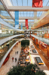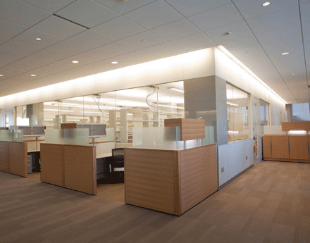 Large interior windows open up views between the teaching labs, research areas and the Town Center below.