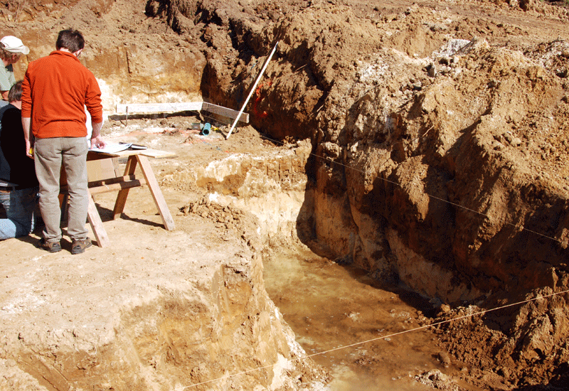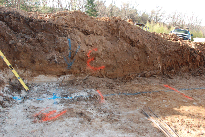 It rained hard overnight, and the site is a muddy mess. The crew won’t be back till next week to put up forms for the walls.