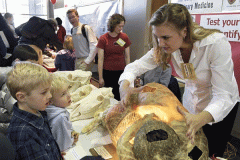 At an exploratory station organized by the School of Veterinary Medicine, student Leslie Estelle shows children an illuminated model of cow's stomach during Science Expeditions, an interactive science and technology outreach event held at Engineering Hall. Photo by: Jeff Miller