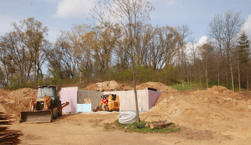 Even our reasonably gentle slope has already cost us and the environment.  Because the ground was sloping and soft and sandy, we had to use a pumper truck, which could park safely below and push the concrete for the foundation high into the air.  But we anticipate that the energy equation will come to rest well on the sustainable side as Underhill House soaks up decades, we’re hoping centuries, of energy savings.