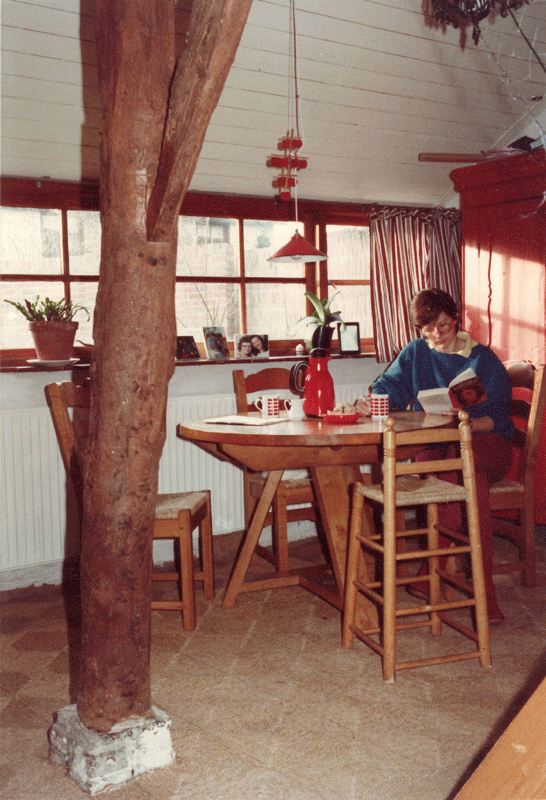 We were  particularly open to the idea of building a whole-tree, unmilled timber frame house because we’ve already had the good fortune to live in a house held up by wooden supports carrying the  individual character of the trees   they came from.  That’s me, having my morning coffee in our Dutch dining area, which was in a part of the house that had originally been a stable.  The house would be called small by American standards, and yet it was both house and barn for its first century or so.