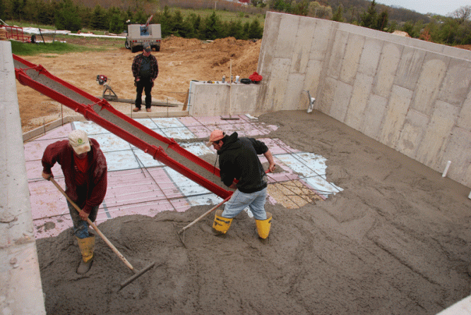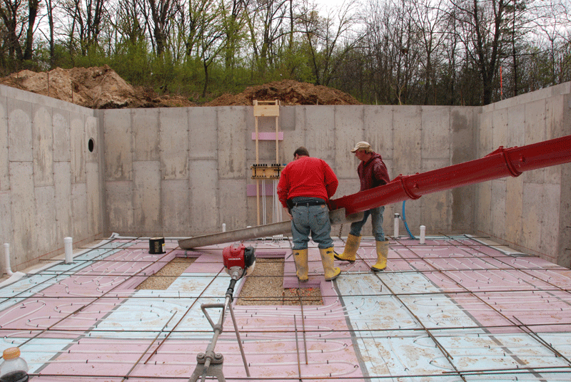 My last post showed how our PEX tubing was installed.  That happened on Monday.  On Tuesday Mike Flynn arrived with his crew to bury it in 4 inches of reinforced concrete and create our basement floor.
