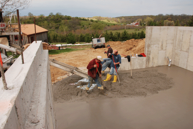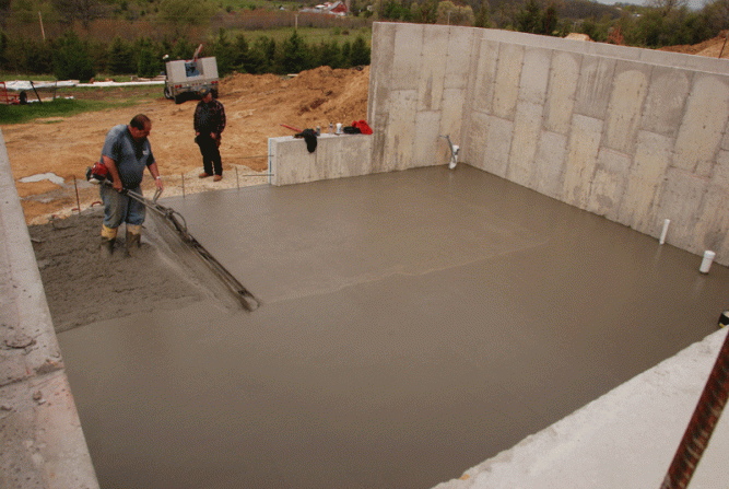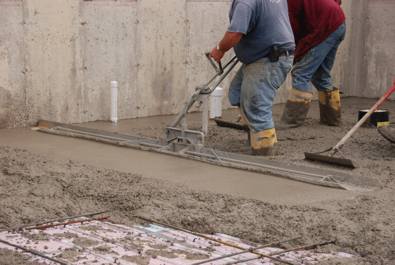 I watched as Mike and his crew moved calmly and deliberately, wading through the concrete slush and spreading it out.  They had marked a red line all around the wall as a guide, and they had placed several rods in the middle of the floor, laser-leveled to the same height.