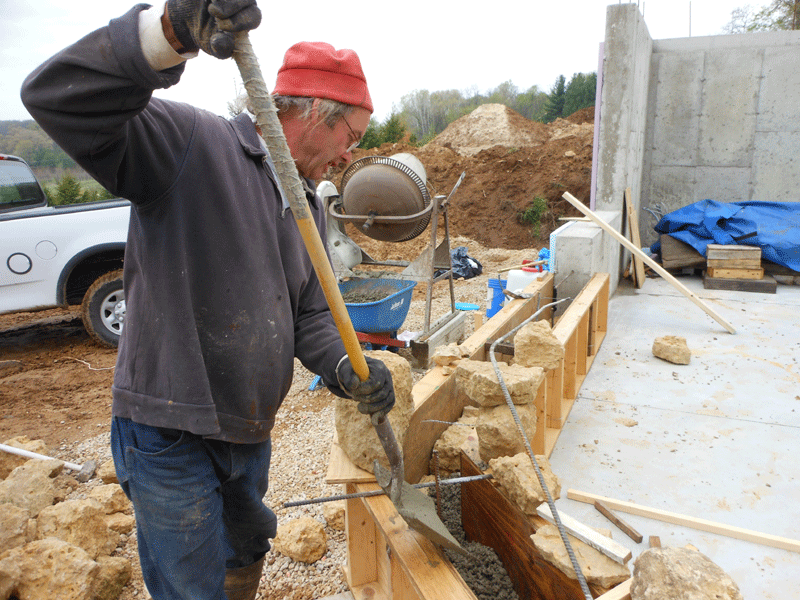 I’ll post part two of this slip-form wall construction on Friday, after the forms are off and the outside surface gets tuck pointed. The final step will be to grout between all the stones and make a good solid surface on the outside.