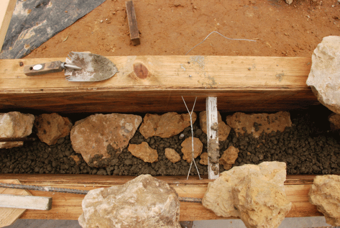 Most of our basement walls are poured concrete buried up against the hill, but part of the south and west walls are exposed with a walkout, and we are making them out of slip-form stone masonry.