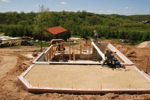 The first step after the concrete foundation walls were poured was to frame out a conventional, 2×8 milled  lumber wall on top of the slip form masonry wall that forms the walkout portion of the basement.  (The milled lumber came from the Ridgeway lumber yard less than two miles up the road.) It was a powerful sensation to actually feel the enclosure of that space.  We invited some friends over the Friday before last and hosted our first dinner – a picnic within four walls and under the vast and darkening sky.