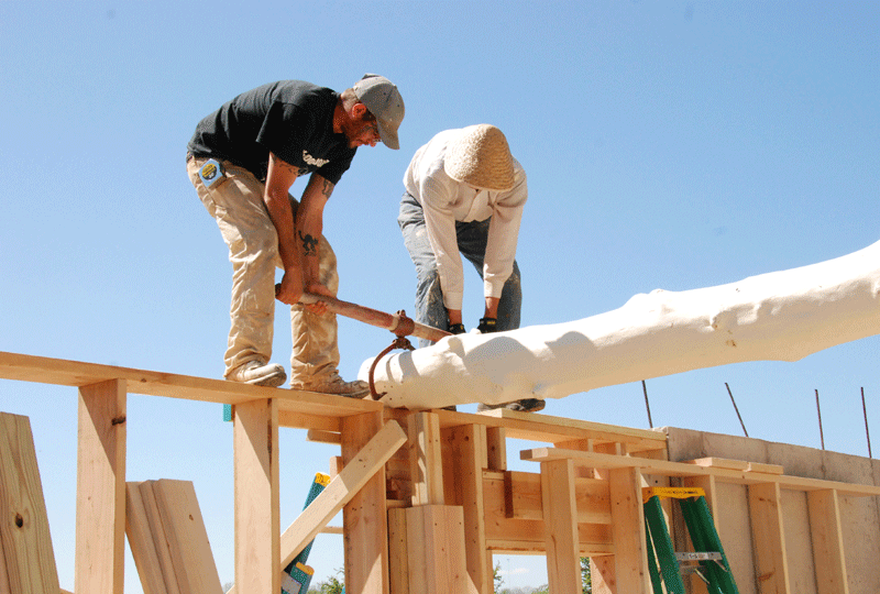 Preparing and fitting together these whole tree timbers has taken more time than putting up a frame of milled lumber, but that time has meant employment in our community for some dedicated and skilled sustainable builders.  It’s also the greenest and most beautiful way I know of to build our house.