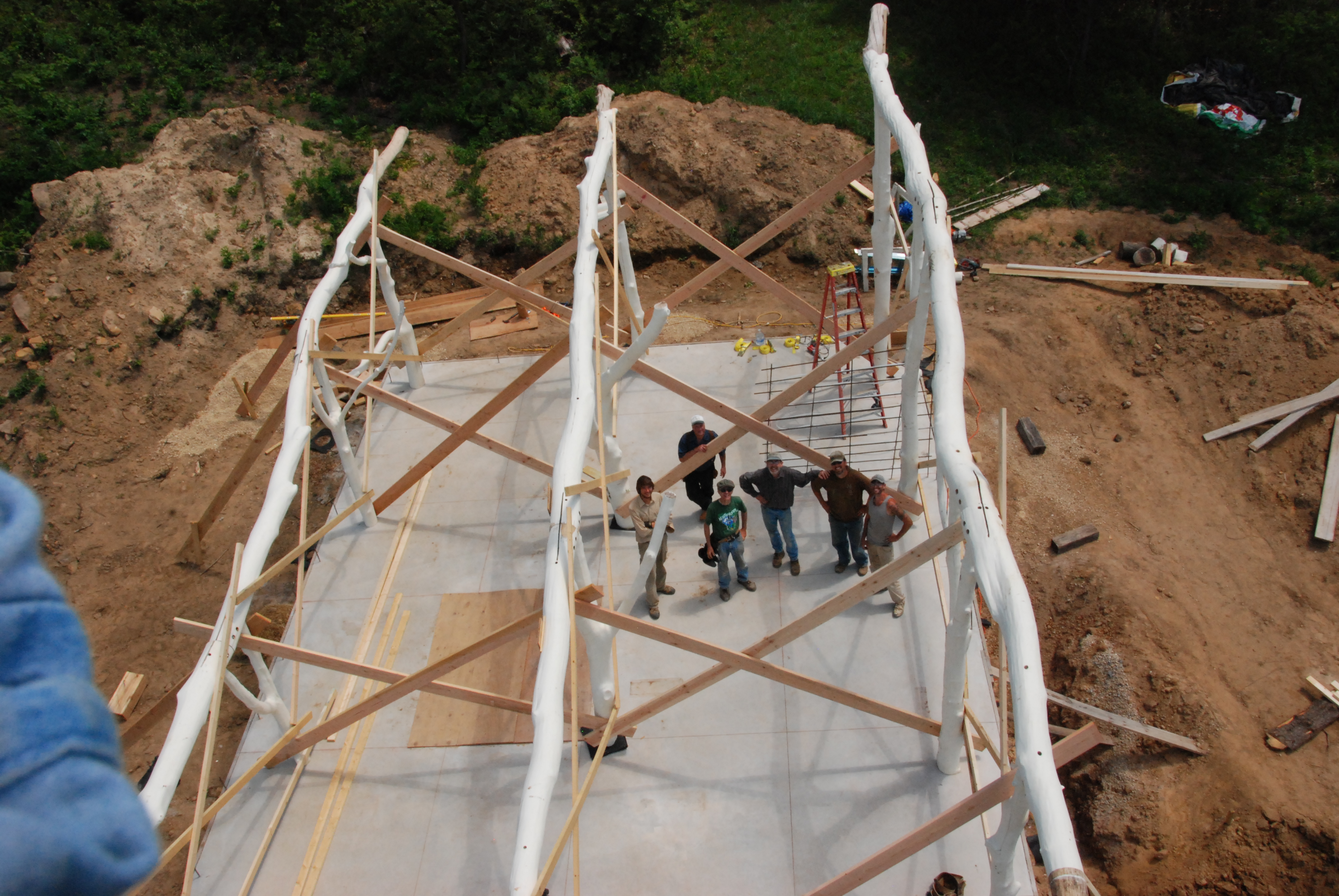 The final bent was lifted off the ground and flown into place without incident. As a temporary measure, all the bents were braced in place with boards that will later be used to frame out interior rooms.