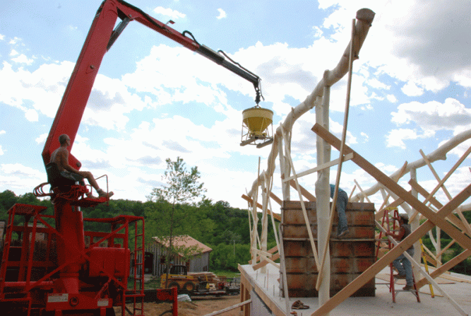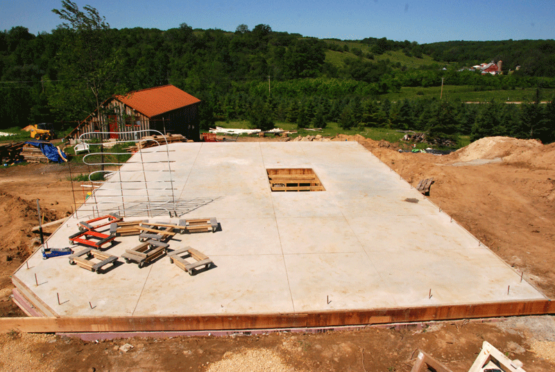 As it turns out Mike Flynn’s crew was back on site the very afternoon that the timber frame was raised, and they poured concrete by the bucketful over and around the rebar and PEX, giving true meaning to the term “mass wall”. The PEX loop in the wall was cheated over to an off-center position about 3 inches from the den and 7 inches from the kitchen/dining room. (Thanks for another great idea, Andy.)