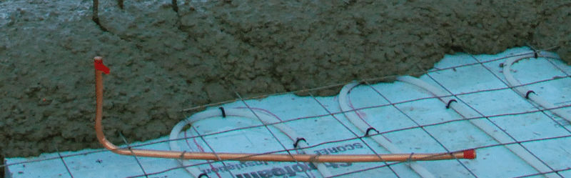 Once again, Andy had a great solution. The thermostat in this room will sense both the air temperature as well as the slab temperature, and use both to determine whether to call for more heat. In order to plan for the floor temperature sensing, Andy and I worked out the dimensions of our outside wall thickness, and he precisely placed a copper pipe to be imbedded in the concrete for housing a slab sensor that will connect with the one in the wall. This way the slab sensor can be easily changed over time, as necessary. No jackhammers needed for the job.
