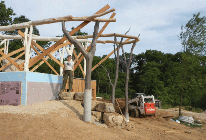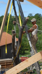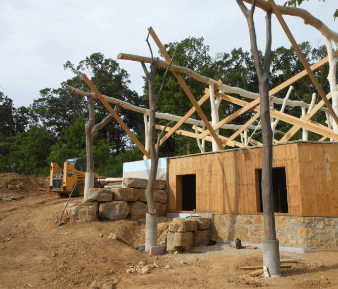 Fitting together the timbers for a whole tree, forked timber frame house is a very creative process that involves a good grasp of geometry and physics in the bargain.