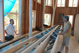 These types of trusses have been used on earlier WholeTrees houses but in our case the thickness of the metal runner tracks has been increased from 25 gauge to 20 gauge, which will make the trusses even stronger. Bryan Dalstrom, our construction manager, suggested this change towards beefier construction, and he’s happy with the improved strength.