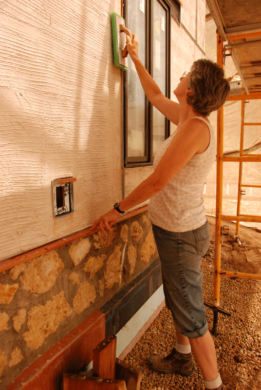Part of the purpose of Underhill House is to demonstrate alternative building materials and techniques. We wanted to use lime stucco, a natural material, and we wanted to use local lime. It had to set up very slowly and that involved misting each of the four coats to slow the drying process. During the record heat of July, Doug and I were clambering about on the scaffolding while dragging heavy hoses – sometimes more than once and hour – trying to slow down the drying and cracking that was occurring as the plaster dried.