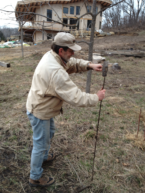 Doug-pounding-in-pegThe bottom of the branch is cut on a slant.  You make a hole in the ground by driving in a metal rod, then push in the branch and tap it on the flat-cut top to make a good connection.