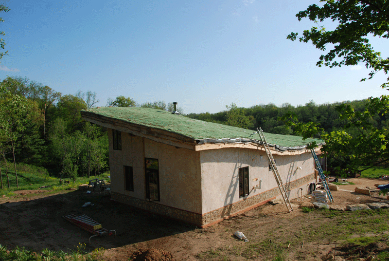 roof-cornerI was told that if we didn’t put the clay on, the wind would blow the erosion matting away.  This was proved false a few days later.