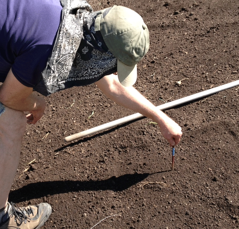 depthOur first task was to make sure we had a soil depth of 3″ all over the roof.  This was a laborious process of sticking pencils marked at 3 inches with tape into the soil over every few feet of the roof.  I did a lot of the bending over and applying my depth guage and marking areas which Doug, and our two assistants hauled dirt to bring  the level up to 3 inches.