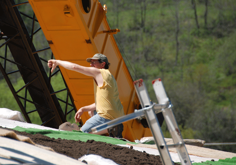 Doug-signalsWe had estimated we would need about 17 cubic yards for the roof, and since the truck holds 21 yards, we asked them to bring a truckfull, expecting to use the rest on the ravaged ground around the building site.here-comes-a-bucket
