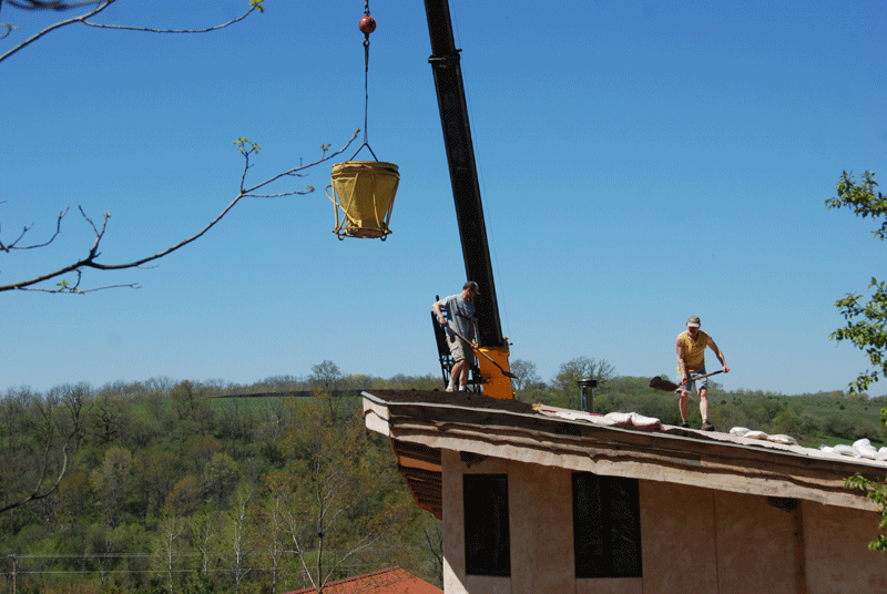 Last Monday the screened dirt arrived.  To get this fine soil on the roof, we needed a crane to hoist it up in a giant bucket.  We turned to McCutcheson Cranes  in Dodgeville just 10 miles away.Tuesday morning the crane was trucked in.  It was a challenge to find a good place to anchor it, and the most secure spot to set up the crane did not allow Mike McCutcheson to see what was going on the roof, so Doug took the task of giving him hand signals about where to swing each bucket full.