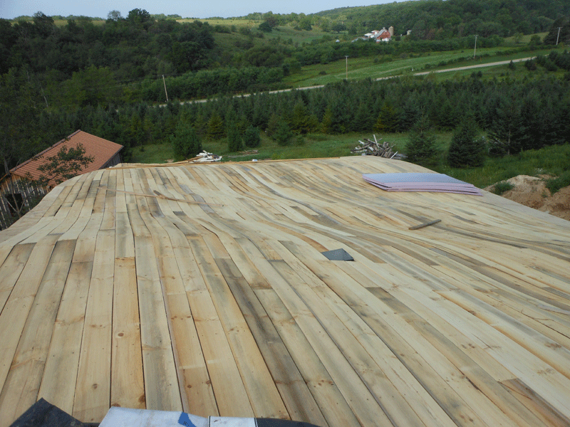 undulating-roofOur roof undulates with the natural curves of the unmilled trees that make up it’s timber frame and rafters.  It’s flowing lines are a thing of beauty and have been an engineering challenge every step of the way.  It is very well insulated with many non-conducting layers including blown in castor bean oil foam that was topped with wood decking and a layer of old billboard tarps and a layer of the kind of rubber sheeting used on flat roofs and under the ponds people make in their yards.  And over that was placed another layer of old billboard tarps to protect the rubber membrane for the winter.