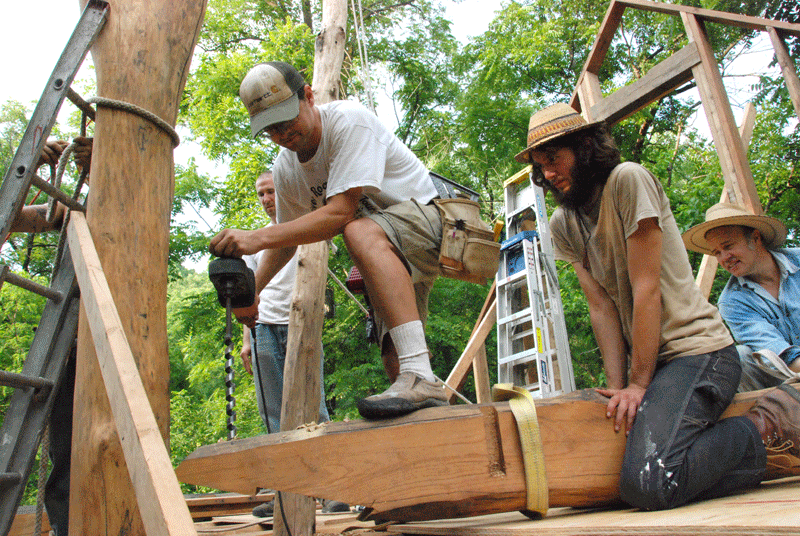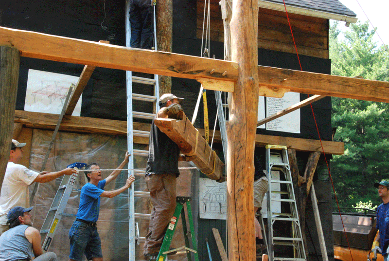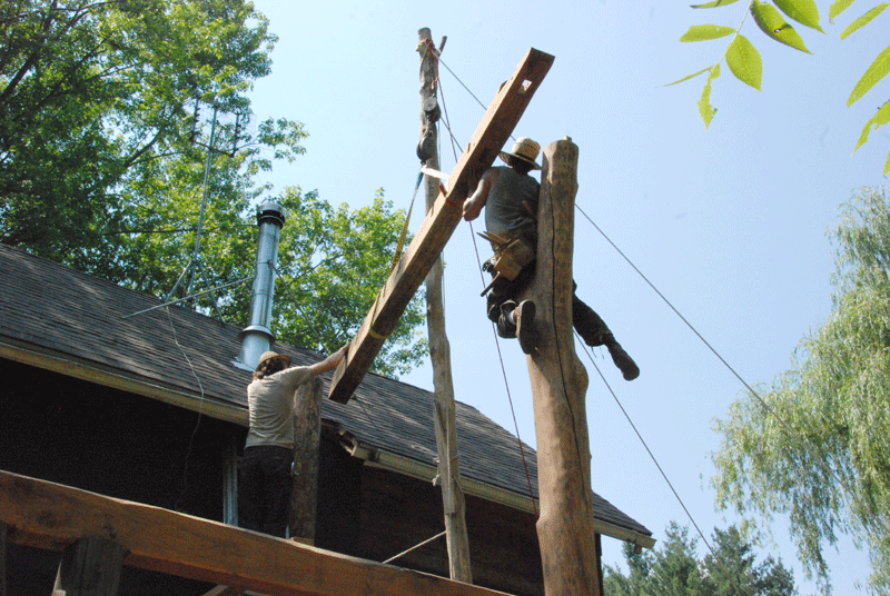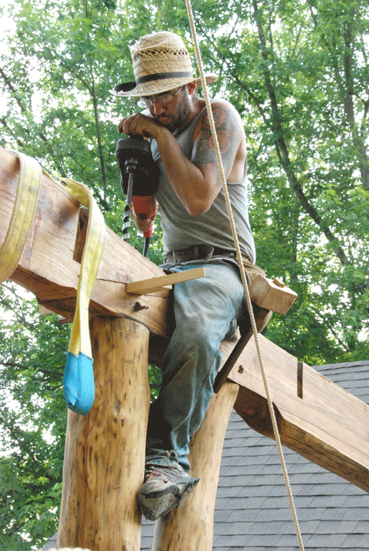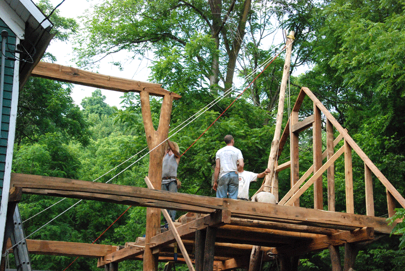 A second ladder was raised to send Brad reinforcements, and Brad dropped the mortised beam down onto its tenon.