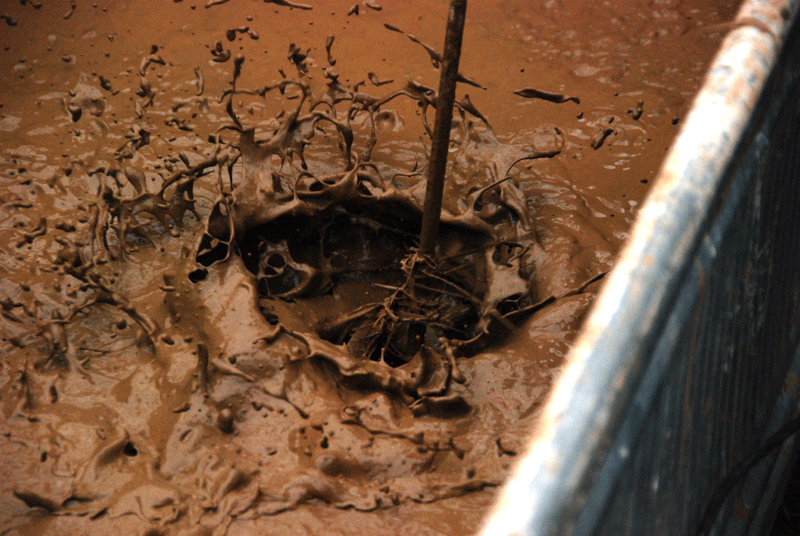 Prairie is using a watering tank to mix the clay slip, a concoction of clay and water mixed together into something that resembles a chocolate shake.  When left for a few days, the clay particles sink, so Doug’s first task was to mix it back up again using a mixing paddle on a power drill.DSC_0077