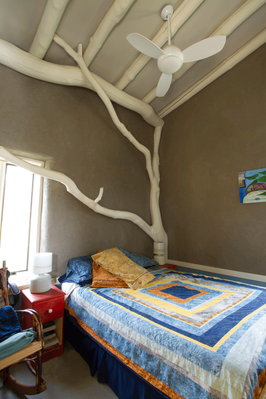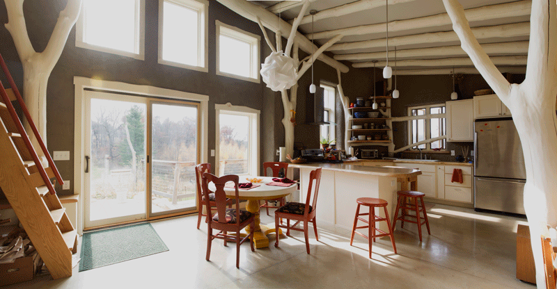 We built Underhill House as an ongoing laboratory to showcase a number of alternative and hopefully more sustainable building materials and techniques such as straw bale walls with lime clay on the exterior and earthen clay on the inside, unmilled branching timber frame , passive solar design , solar hot water and infloor heat, and a sod roof – all of which are working very well, so we love a chance to spread the word. We were very pleased when Lauren Mather called to ask if they could interview us about Underhill House.