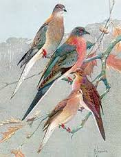 imagesThey were on a perpetual airborne quest for forested areas east of the Rocky Mountains where beech nuts and acorns were having a great year. Where ever their favorite food was most abundant, they would gather in millions, fill the trees with flimsy nests, and hatch one chick, whom they would stuff till all the food on the forest floor was consumed.  Then they would rise in a black cloud and disappear like smoke.